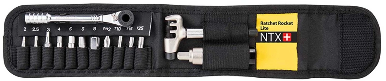 Ultrakompaktes Ratschenset mit eingestelltem Drehmomenten. Ratchet Rocket Lite NTX+ bietet unterwegs alles, was zur Reparatur der meisten Defekte benötigt wird. Mit Feinzahnmechanismus, Präzisions-Daumenhebel zum Umschalten der Laufrichtung, Daumenrad für Direktantrieb und Nano TorqBits zum exakten Einstellen des korrekten Drehmomentes.